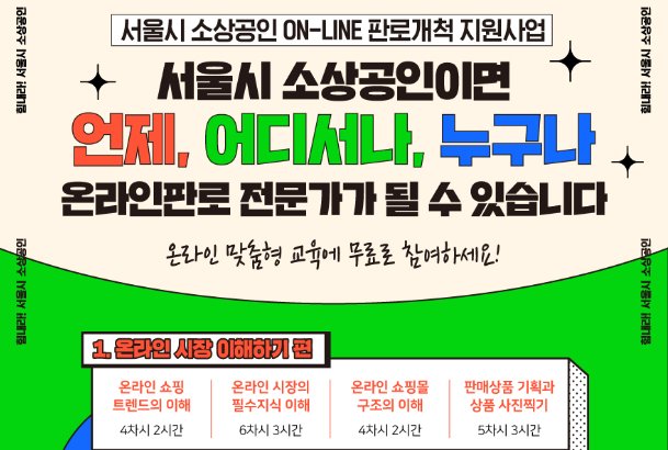 서울시 소상공인 판로개척을 위한 ‘온라인시장 진출 교육’은 사이버연수원 누리집에서 상시 신청할 수 있고, 신청 즉시 수강이 가능하다. 교육비는 무료다.