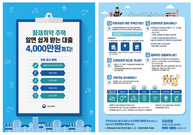 화재예방, 감지, 소화(소방)에 필요한 공사를 진행할 경우 세대(호) 당 최대 4천만원, 연이율 1.2%(5년 거치, 10년 상환) 대출이 가능하다.