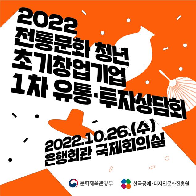 문화체육관광부(이하 문체부)는 한국공예·디자인문화진흥원(이하 진흥원)과 함께 전통문화산업 분야 청년 초기창업기업이 새로운 유통 경로를 확보하고 투자 유치를 통해 도약할 수 있도록 10월 26일(수), 서울 은행회관에서 ‘2022 전통문화 청년 초기창업기업 유통·투자상담회’를 개최한다.