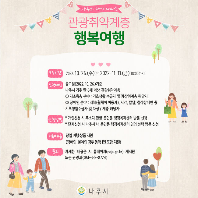 나주시(시장 윤병태)는 ‘2022년 전남 관광취약계층 행복여행활동 지원 사업’ 참가자 및 단체를 오는 11일까지 모집한다고 4일 밝혔다.