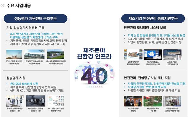 2021년부터 5년간으로 추진하는 ‘제조분야 친환경 관리 인프라 구축사업’은 환경친화적 산업구조 전환을 위해 국비 408억 원과 지방비 140억 원, 민자 71억 원 등 총 사업비 619억 원을 들여 3개 권역(수도권, 동남권, 호남권)에 ‘친환경 관리 인프라’ 및 ‘안전관리 통합지원시스템’을 구축해 제조기업·제품의 친환경·안전관리 역량 강화를 지원한다. 이를 위해 지원센터에는 2025년까지 국비 169억 원, 시비 60억 원, 민간 10억 원 등 총 239억 원을 투입할 예정이다.
