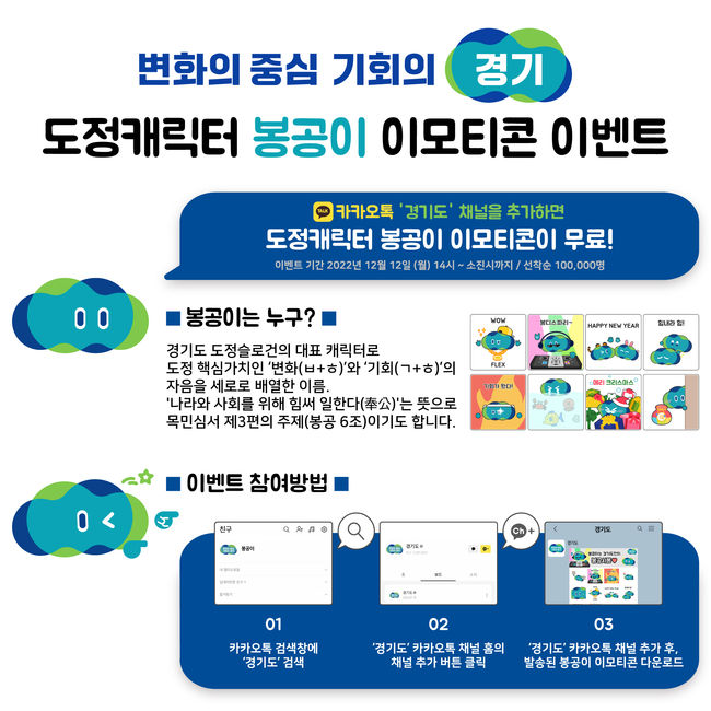 한편 도는 경기도 브랜드 확산을 위해 도정슬로건 캐릭터인 ‘봉공이’ 이모티콘을 무료로 배포하는 이벤트도 진행한다. 캐릭터 ‘봉공이’를 활용해 성탄절과 연말연시에 재치 있게 사용할 수 있는 문구들을 포함한 움직이는 이모티콘 16종을 배포할 방침이다.