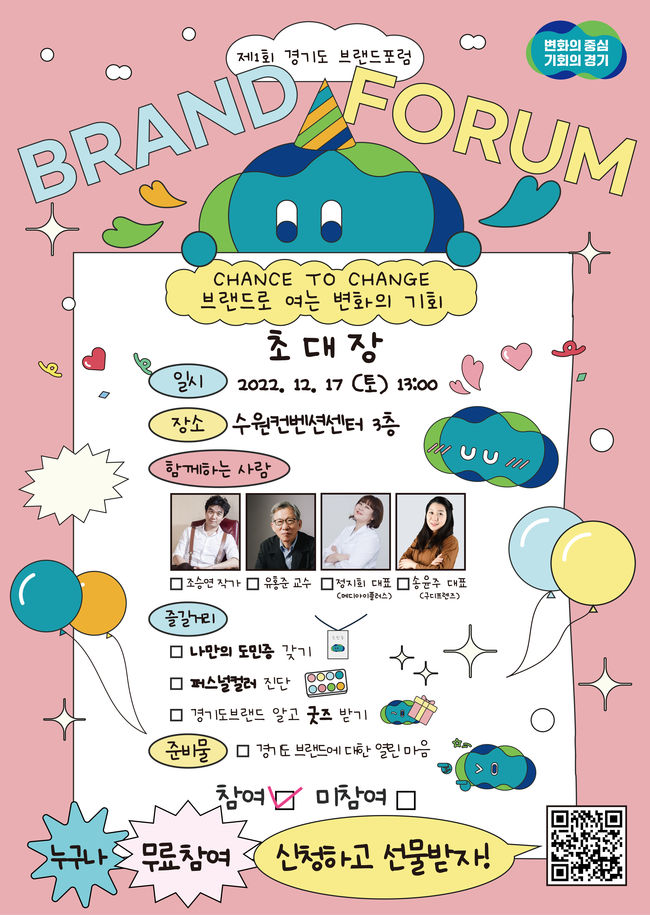 포럼에 참여를 희망하는 도민은 경기도 브랜드 포럼 공식 누리집을 통해 사전 신청할 수 있으며, 현장에서도 누구나 자유롭게 참여할 수 있다. 포럼 당일 경기도청 유튜브 실시간 생중계를 통한 댓글 참여 등 다양한 이벤트도 마련했다.