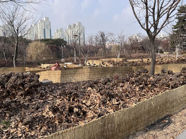 영통구는 올해 신규 조성한 신동 수국정원에 첫 겨울을 보내는 수국의 건강한 뿌리생장을 위해 공원에 쌓인 활엽수 낙엽 1.5톤을 멀칭재료로 활용했다.