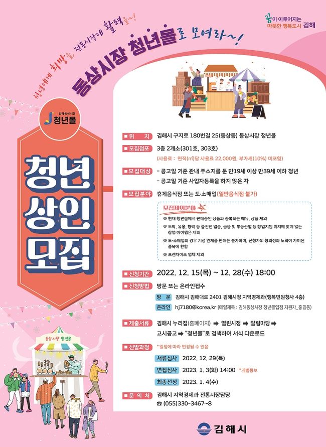 서류평가와 면접을 거쳐 최종 선발하며 입점을 희망하는 예비 청년상인은 김해시 누리집에서 신청서와 첨부서류를 내려 받아 오는 28일까지 시청 지역경제과 전통시장팀을 방문하거나 이메일로 접수하면 된다.