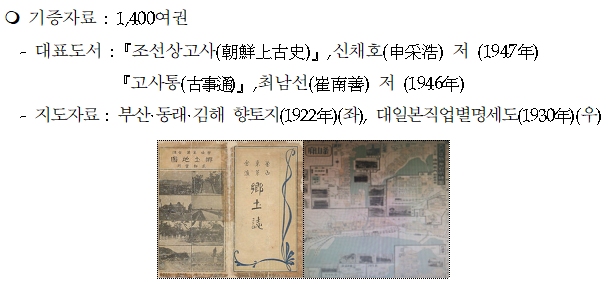 기증자료는 75년간 한국사 및 부산의 역사를 연구하면서 저술한 본인의 저서 및 공저, 역사 컬럼을 비롯 신채호의 조선상고사(朝鮮上古史), 최남선의 고사통(古事通) 등의 고서 등이 있다. 특히 일제 강점기 제작된 `부산·동래·김해 향토지`라는 관광안내도는 90여 년 전 부산을 대하는 일본인의 시각을 엿볼 수 있는 귀중한 자료로 평가된다.