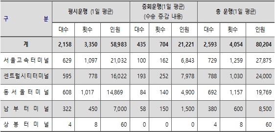 평시대비 증차 현황은 운행 대수 2,593대(435대․20%↑), 운행 횟수 4,054회(704회․21%↑), 수송인원은 80,204명(21,221명․36%↑)이다.