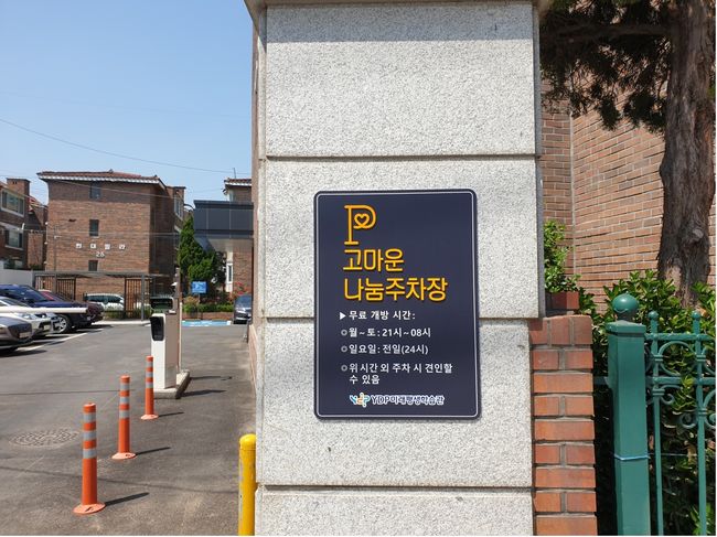 영등포구 대림동 YDP미래평생학습관 주차장 출입구에 부착된 `고마운 나눔주차장` 팻말