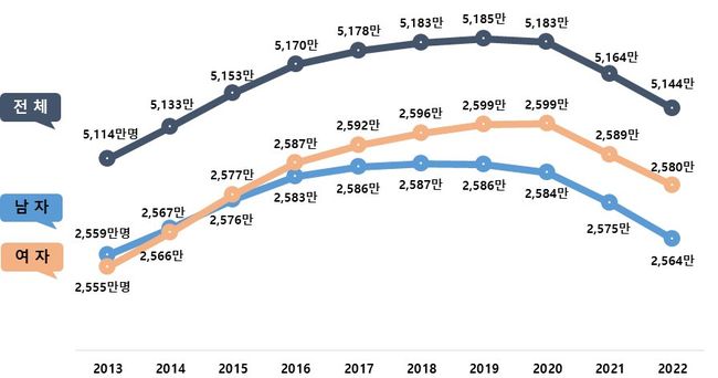 2022년 12월 31일 기준, 우리나라 주민등록 인구통계에 따르면, 주민등록 인구는 51,439,038명으로 2021년(51,638,809명/’21.12.31 기준)에 비해 199,771명이(-0.39%) 줄어들었다.