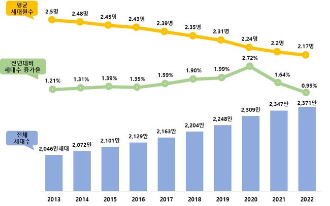 세대수 증가는 해마다 지속되고 있으며, 2021년말 대비 232,919세대(0.99%↑) 증가하여 23,705,814세대를 기록했고, 평균 세대원수는 사상 최저치인 2.17명으로 감소했다.