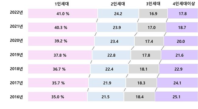 1인 세대는 증가세가 이어져 9,724,256세대(41.0%)를 기록하여 1,000만 세대 돌파를 목전에 두고 있는 반면, 3인·4인 세대 이상 비중은 꾸준히 감소세를 보이고 있다.