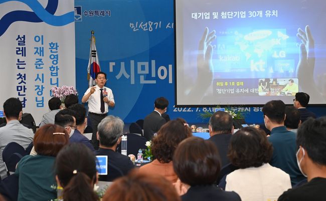 이재준 수원특례시장이 지난 8일 영통구에서 개최된 `시민이 꿈꾸는 수원이야기`에서 영통구민을 대상으로 민선 8기 핵심 공약을 설명하고 있다.