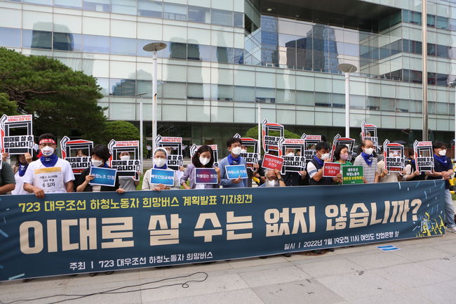 민주사회를 위한 변호사모임(민변) 등 40여개 시민사회단체는 19일 서울 여의도 산업은행 앞에서 `7.23 대우조선 하청노동자 희망버스` 기자회견을 열고 `대우조선 하청업체 노동조합의 파업을 지지한다`고 밝혔다.이날 기자회견에서 참가 시민단체들은 ‘7.23 대우조선 희망버스’가 전국에서 탑승객들을 태우고 오는 23일 각지에서 출발한다고 발표했다.