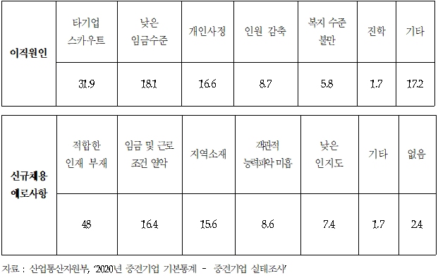 산업통산자원부와 통계청 자료를 보면, 2020년 대기업의 평균 연봉은 6,348만원이었으나, 중소기업은 3,108만원으로 대기업의 절반(49%)에도 미치지 못했다. 또 300인 미만 사업장의 대졸 초임은 2,983만원으로 대기업(300인 이상) 5,084만원의 절반을 조금 넘는 수준이었다. 기업의 성장동력을 확보하기 위해서는 우수인재 영입이 필수적이나 중견기업의 임금 수준은 대기업보다 한참 낮은 실정이다.