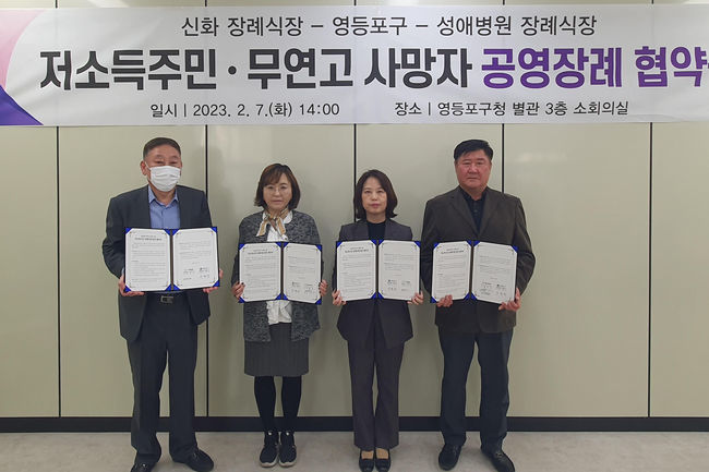 영등포구가 무연고 및 저소득 주민 사망자의 공영 장례를 위해 지난 7일 관내 신화장례식장 및 성애병원장례식장과 업무협약(MOU)를 체결했다고 밝혔다.