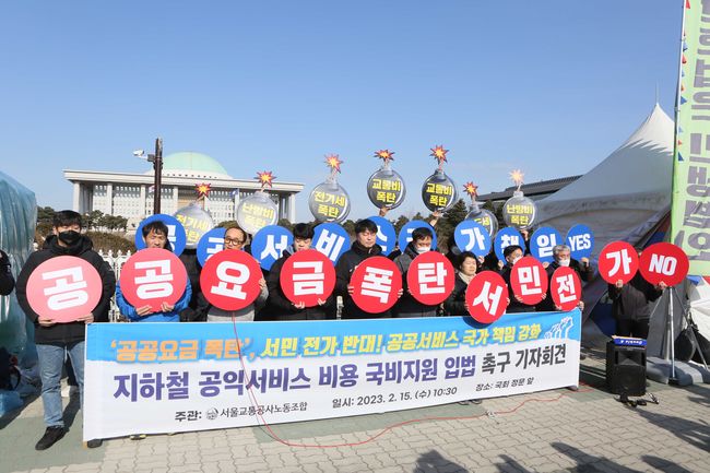 서울교통공사노동조합은 15일 국회 정문 앞에서 지하철 공익서비스 비용 국비지원 입법 촉구 기자회견을 통해 "고물가 경제, 침체로 서민들은 고통받고 있는 와중에 정부와 지방자치단체는 책임 떠넘기기에 여념이 없다. 끝없는 공방의 종착점은 결국 공공요금 폭탄으로 서민에게 부담을 전가하는 것이다"라고 지적했다.