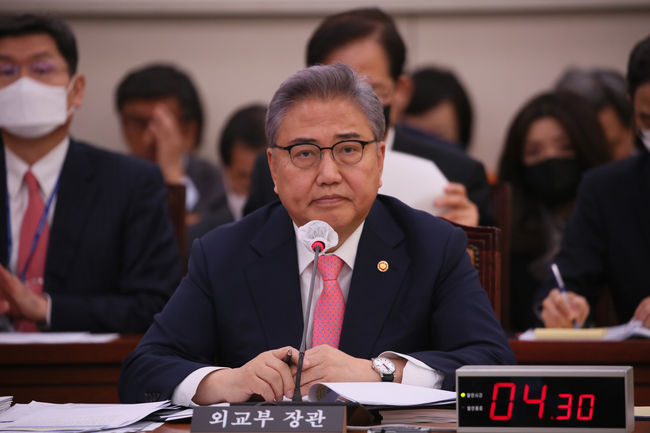 박진 외교부 장관이 국회에서 열린 외교통일위원회 전체회의에 참석해 의원들의 질의에 답변하고 있다.