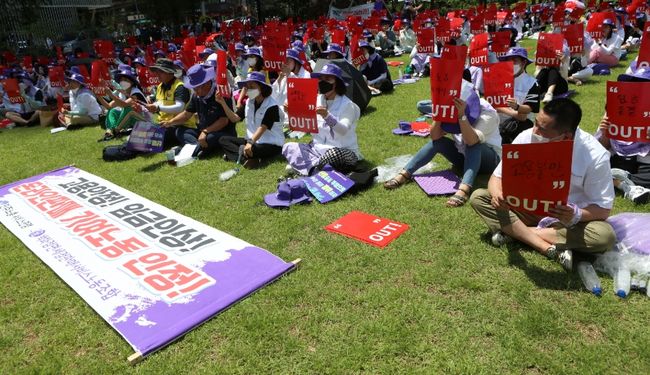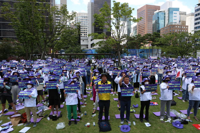 백화점 · 면세점 판매서비스 노동자들은 25일 서울 중구 한빛광장에서 투쟁승리 결의대회를 진행했다.백화점·면세점 판매서비스 노동자들은 25일 서울 중구 한빛광장에서 투쟁승리 결의대회를 진행했다.