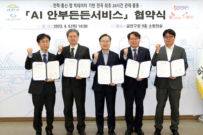 금천구는 4월 6일 서울시 복지재단, SK텔레콤, 한국전력, 재단법인 행복커넥트와 ‘AI 안부든든서비스’ 사업 추진을 위한 상호협력과 정책적 지원을 약속하는 업무협약을 체결했다.