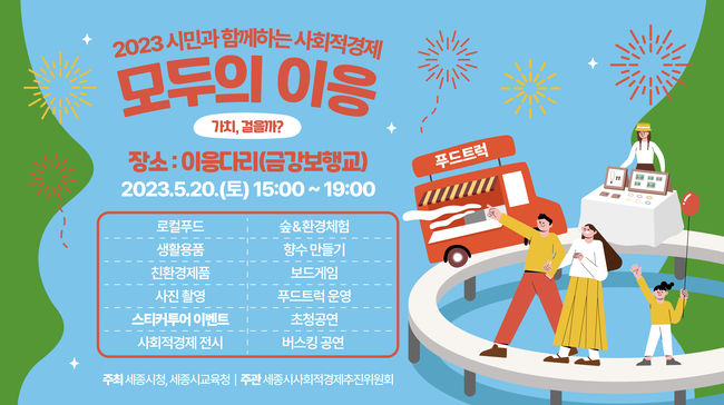 세종특별자치시가 주최하고 세종시 사회적경제 추진위원회가 주관하는 세종시 사회적경제 ‘모두의 이응’ 행사가 오는 20일15시부터 이응다리에서 열린다고 밝혔다.