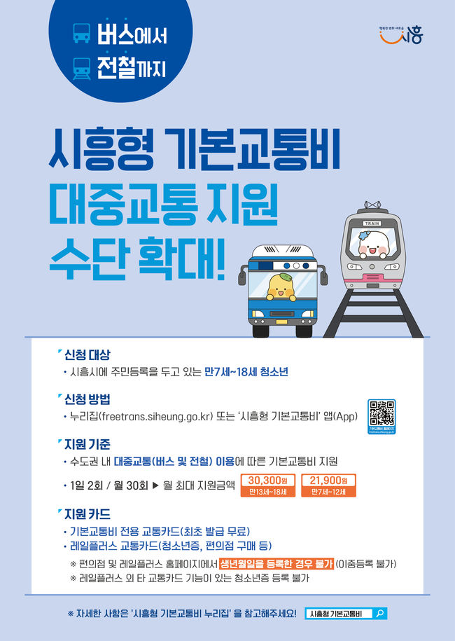 시흥시가 청소년의 이동기본권을 보장하고, 대중교통 이용 활성화를 위해 ‘시흥형 기본교통비 지원 사업’ 정책을 29일 자로 개선·강화했다.