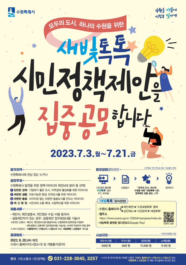 수원시는 7월 3일부터 21일까지 ‘모두의 도시, 하나의 수원을 위한 새빛톡톡 시민 정책제안 집중 공모’을 진행한다고 밝혔다.