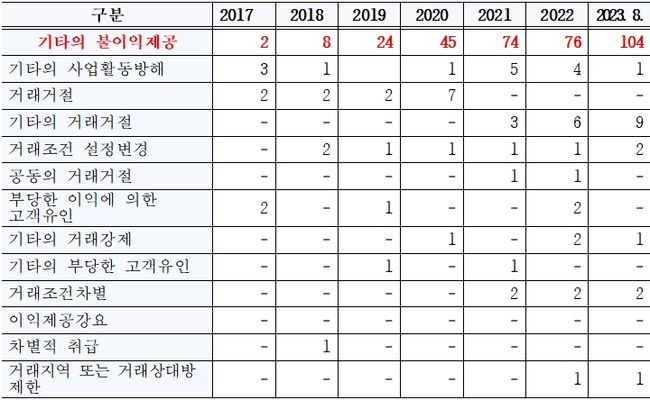 온라인 플랫폼 분쟁이 대폭 증가한 이유는 온라인 플랫폼 사업자와 입점 업체 간 분쟁과 밀접한 관련이 있다. 실제로 온라인 플랫폼 사업자가 입점 업체에 내린 불이익 조치로 분쟁이 접수된 건수는 2017년 2건에 불과했지만 2023년 8월 말 현재 104건으로 52배나 늘었기 때문이다.