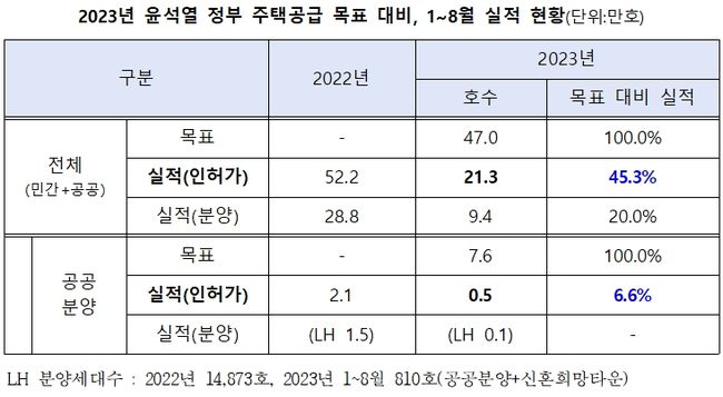 9일 국회 국토교통위원회 소속 더불어민주당 김병욱 국회의원(분당을)이 국토교통부와 한국토지주택공사(LH)로부터 제출받은 ‘윤석열 정부 주택 공급대책 계획과 실적, 분양세대수’ 자료에 따르면, 윤석열 정부의 2023년 연간 주택공급 계획(민간+공공) 47만호 목표 대비, 올해 1~8월 인허가 기준 공급실적은 21.3만호(45.3%)로 확인됐다.