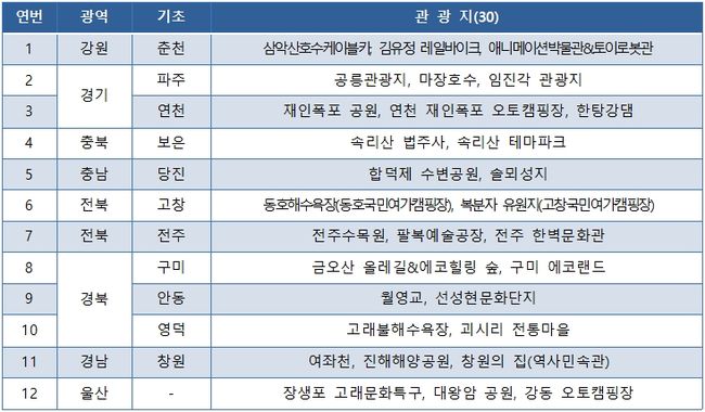 문체부는 1차 신청 자격 확인, 2차 서면 심사, 3차 현장평가를 거쳐 유네스코 세계문화유산, 레일바이크 등 누구나 선호하는 관광지 총 30개소를 최종 선정했다.