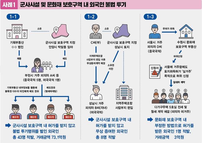 수사결과, 군사시설 및 문화재 보호구역 내 외국인 불법취득 사례를 보면 부천에 거주하고 있는 중국 국적 A(64세, 여)는 안양 소재 군사시설보호구역 내 임야를 토지취득 허가 절차 없이 매매계약을 체결했다. A는 기획부동산업체 직원으로부터 해당 토지 인근 군부대가 이전할 것이라는 내부 정보 등을 듣고 개발 이후 시세차익을 노리며 투기했고, 주변 사람들에게도 매입을 권유하는 등 투기행위에 적극 가담했다.