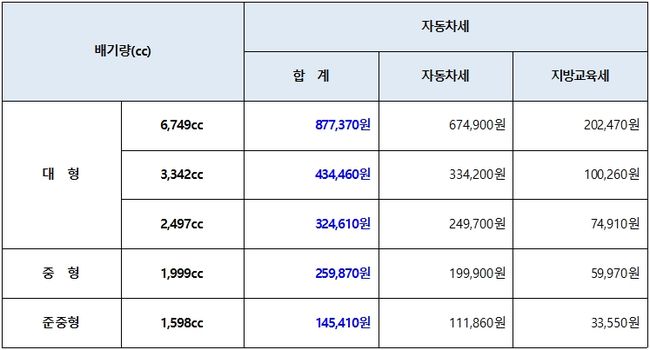 배기량별 자동차세 부과액 예시(비영업용, 신차 기준)
