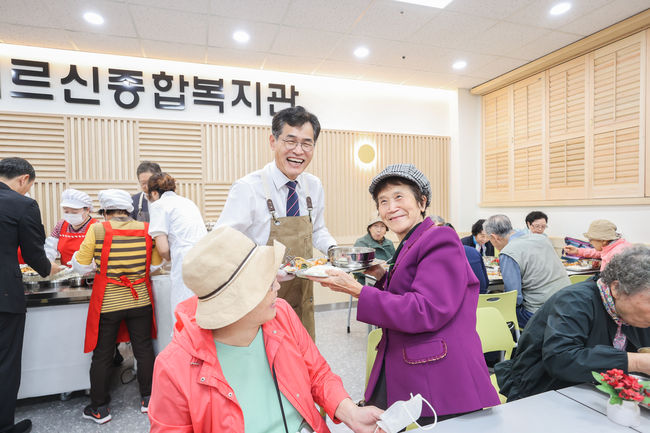 양천어르신종합복지관 경로식당에서 어르신들께 따뜻한 한끼 식사를 배식 중인 이기재 양천구청장