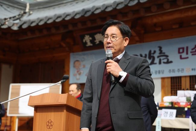박강수 마포구청장이 정월대보름을 맞아 광흥당에서 구민의 행복과 안녕을 기원하는 축사를 전하고 있다