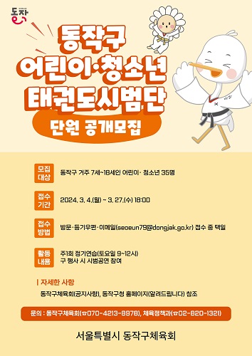 서울 동작구가 올해 4월 창단하는 ‘동작구 어린이.청소년 태권도 시범단’의 단원을 오는 27일까지 공개 모집한다고 밝혔다.