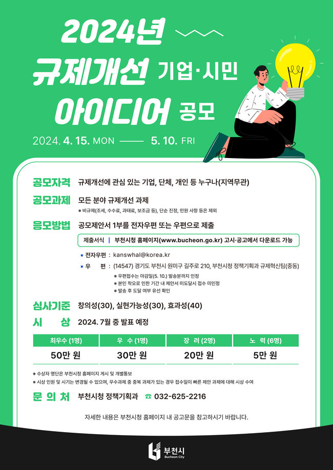 부천시는 일상생활과 기업 경영활동에 불편을 주는 불합리한 규제를 시민과 함께 발굴·개선하기 위해 ‘2024년 규제개선 기업·시민 아이디어 공모전’을 개최한다고 밝혔다.