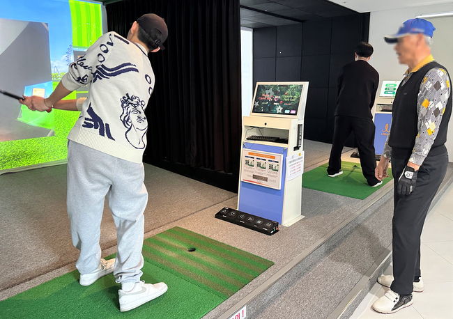 어르신에게 `스크린 파크 골프`를 배우고 있는 청년 모습