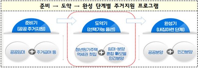 준비 단계는 저소득층, 무주택 서민을 위한 양질의 공공임대주택, 주거급여 강화, 도약 단계는 청년원가/역세권 첫집, 임대-분양의 장점을 혼합한 민간분양 新모델 등, 완성 단계는 재개발 재건축, 신규택지 등에서 공급되는 분양주택으로의 주거 상향 등으로 이루어진다.