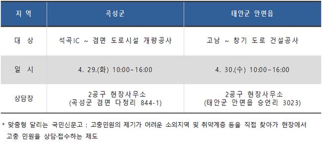 곡성군은 29일(화) 2공구 현장사무소(곡성군 겸면 다정리 844-1)에서, 태안군은 30일(수) 2공구 현장사무소(태안군 안면읍 승언리 3023)에서 오전 10시부터 오후 4시까지 운영될 예정이다.