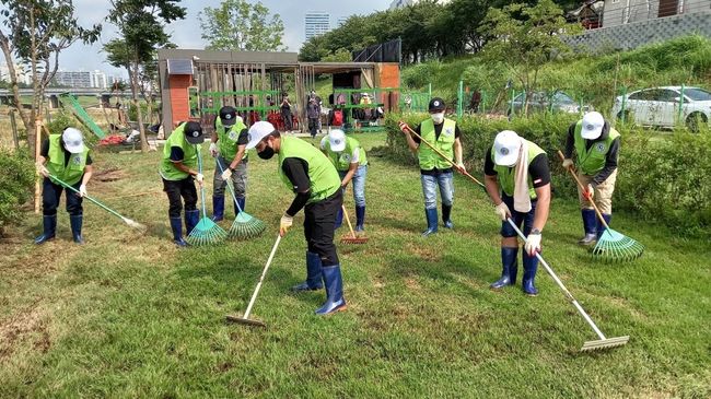 지난 21일 오전 10시 금천한내 파크골프장 현장에는 지구촌다문화연맹 회원인 외국인 유학생 및 근로자(인도네시아, 필리핀, 미얀마) 27명이 수해로 손상된 잔디 정리, 토사물 제거 등 수해복구 작업을 진행했다.