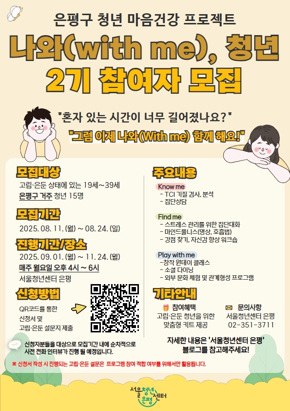 은평구, 청년 마음건강 프로젝트 `나와(with me), 청년` 2기 참여자 모집.
