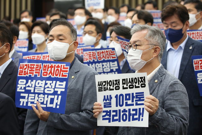 우상호 비상대책위원장 등 민주당 의원들은 의원총회에서 윤 정부의 쌀값 대책을 촉구했다.앞서 우 위원장은 지난 22일 비대위 회의에서 "약 10만 톤 정도만 추가로 쌀을 격리하면 쌀값이 안정될 수 있다고 전문가들이 분석하고 있다"며 "추석 전에 시급하게 쌀을 격리할 것을 정부에 촉구한다"고 주장한 바 있다.